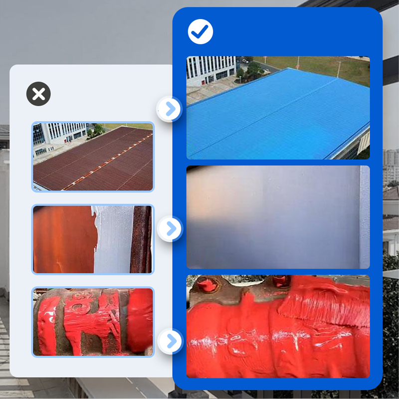 EENVOUDIGE AANBRENGEN, GEEN INGEWIKKELDE VOORBEREIDING - Bespaart tijd en moeite – geen uitgebreide roestverwijdering of primer nodig; breng het gewoon direct aan op voorbereide oppervlakken. Veelzijdig te gebruiken op gekleurde stalen daken, zeecontainers, leuningen, metalen constructies en andere bouwfaciliteiten.